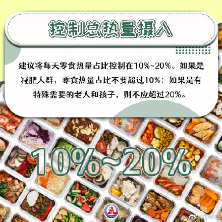健康人群每天零食热量比例控制在10%-20%之间;如果是减肥人群,零食热量占比建议不要超过10%;如果是有特殊需要的人群(如老人和孩子),则不应超过20%。