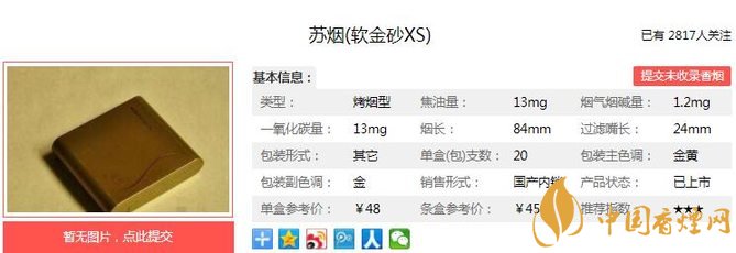 利群夜西湖烟支长84mm,过滤嘴长24mm,从外到内在质量都力求卓越,精工制作,追求高质量、高档次、高品味。下面我们一起来看苏烟软金砂XS的参数信息:焦油量:13mg 烟碱量:1.2mg 一氧化碳量:13mg