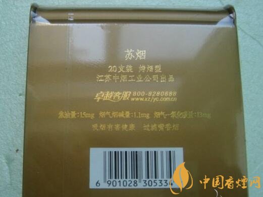 暗金色塑盒包装,主体为方形,上下两侧作弧形处理,给人以轻巧圆润之感。正面左侧一道极似女人身体曲线的“S”形划过,旁边有繁写的“蘇煙”二字,右下方是“江苏中烟工业公司出品”,设计简约,表意婉约。背面标有商品的基本信息(包括三项理化指标、条形码等)和警示语。其余四面皆无文字或图案。