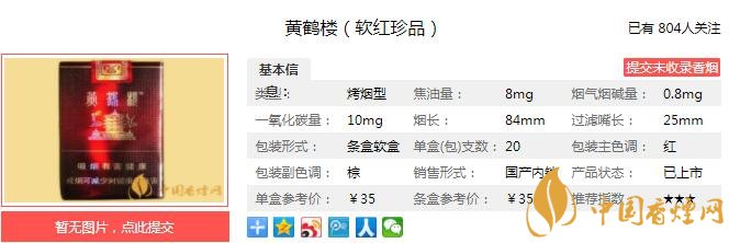 黄鹤楼(软红珍品)定位中高端市场,包装低调奢华,口感可以在黄鹤楼的30元档排名前三。经小编市场调查黄鹤楼(软红珍品)售价为35元/包。