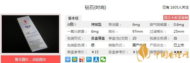 钻石时尚烟支长97mm,过滤嘴长25mm,定位在细支烟品类。94mm的烟支风格,纤细、挺拔、优雅,让消费者感受到钻石时尚的优雅风范和时尚魅力,体现出细支烟产品独有的魅力。下面我们一起来看钻石时尚的参数信息:焦油量:6mg 烟碱量:0.6mg 一氧化碳量:6mg