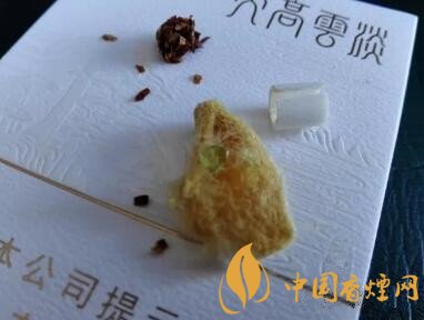 一小段材质较硬的过滤嘴。海绵体内包裹着的,是一颗淡绿色的香珠。同时,过滤嘴纸张内,附着一层黄色的纸张。总之,过滤嘴里内容丰富的很。