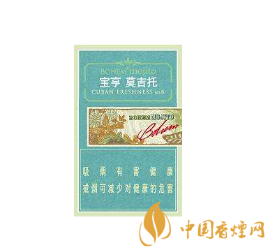 宝亨.莫吉托(Bohem mojito)香烟,精心选用世界一流品质的云南烟叶,配合用巴西和美国1~2级烤烟烟叶,制作出这款口感醇厚清爽的顶级香烟。其顶级口感已经经过众多爱烟者的一致肯定。产品刚上市,短短5个月内就突破市场5%的占有率。除了其精心挑选的材料之外,还独特地在烟叶中赋予了莫吉托清爽的鸡尾酒香。比一般香烟的薄荷味道更加醇厚浓郁。