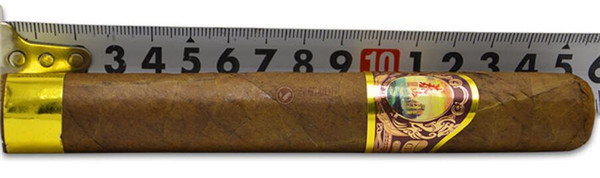 茄体结构精粮,呈现为深褐色,衣帽下端配有金色的印花双标,茄体底端处配有纯金色的标双,双重标环奠定了其尊贵的品质,使它看起来华丽无比。