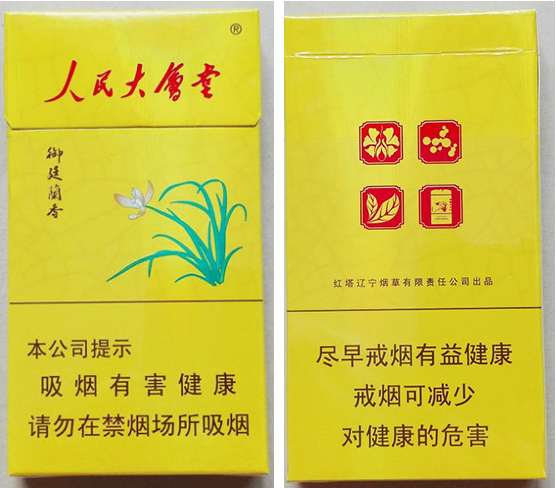 外在设计:“人民大会堂(蘭香细支)”商标设计采用明黄色调,延续“御庭蘭香”产品包装的设计风格,承接其高端势能。其设计从钧瓷文化中汲取灵感,创意来源于钧瓷的“开片”工艺。采用瓷面纹理装潢,釉下五彩玉面瓷纹,釉色光泽如玉,瓷纹清晰如网。商标主图案配以红花绿叶,四瓣兰花栩栩如生,暗香浮动,透射出与生俱来的皇家贵胄气质。在明黄色的瓷面主色调映衬下,整体风格典雅华贵,清新明快,实现了中国瓷器文化与现代设计工艺的完美结合。
