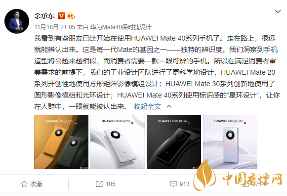 昨日晚间华为消费者业务CEO、华为常务董事余承东在社交媒体上表示,“独特的辨识度”是每一代Mate的基因之一。我们洞察到手机造型将会越来越相似,而消费者需要一款一眼可辨的手机,所以在满足消费者审美需求的前提下,我们的工业设计团队进行了更科学地设计。