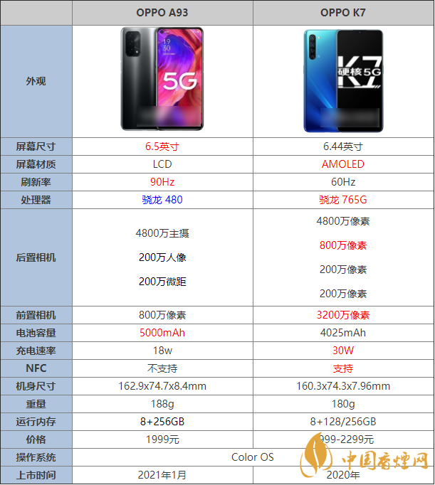 OPPOA93:搭载骁龙480 处理器,8nm制程工艺,“2+6”八核架构,2.0Ghz A76*2,GPU型号为Adreno 619。