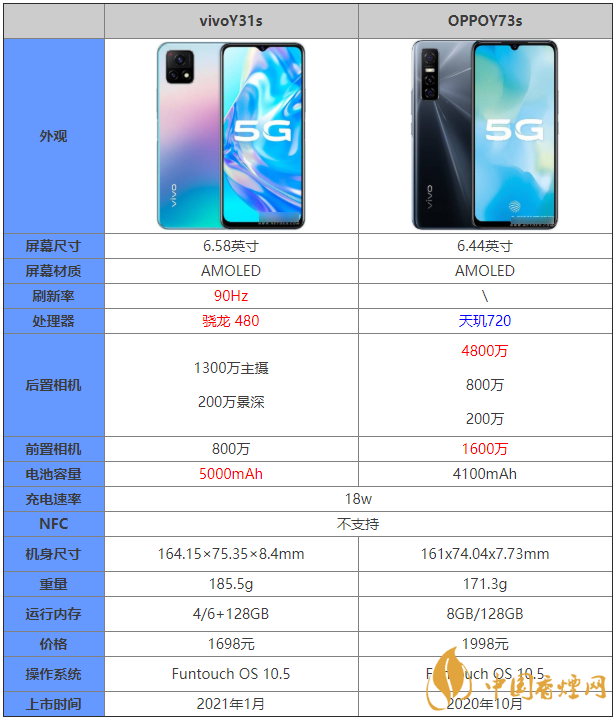 vivo Y31s:搭载骁龙480处理器,8nm制程工艺,两个主频达2.0Ghz的A76内核,GPU型号为高通 Adreno 619