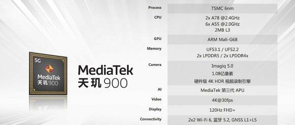 其次就是GPU是G68,这里有必要来说一下其实G68就是G78架构,此外LPDDR5也是被天玑900所支持,所以天玑900虽然性能不算强,但架构和内存技术却更先进。