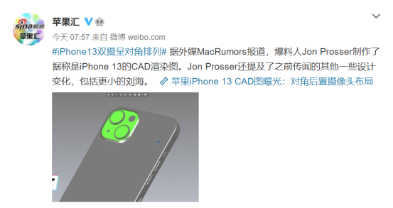 现在的最新爆料则显示,在新iPhone 13系列中苹果将为其采用一种对角排列的镜头方案。不过,这样的说法也并不是第一次出现,此前的多份爆料中也曾提到过这一设计。
