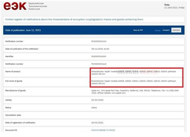 按照往年惯例,今年的新iPhone的升级可能并不会太大,但依旧吸引了大家关注的目光。现在有最新消息,近日有外媒发布信息称,iPhone 13系列机型的认证信息已出现在欧亚经济委员会(EEC)数据库中。