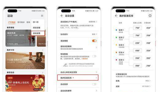 2。 点击右上角四个圆点的按钮,选择‘运动模式’,找到‘跑步配速区间’;