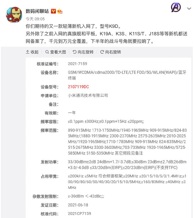 据爆料达人透露,小米型号为2107119DC的轻薄新机已于6月18日拿到了入网核准证,小编猜测对应的应该就是小米CC系列新机了吧?爆料还称小米还准备了多 款新机,从千元到万元价位段全覆盖。