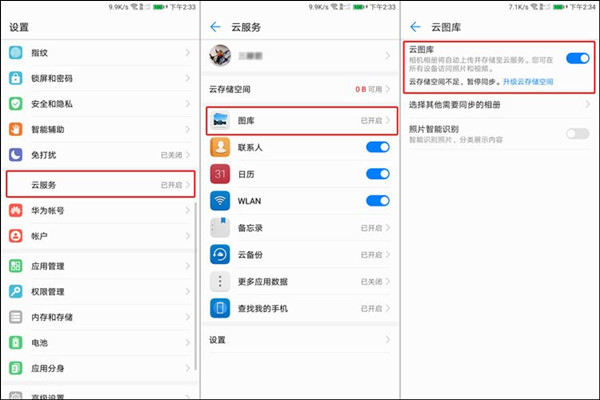 第一步:打开手机里设置——云服务——图库,看“云图库”的选项是否已经开启;第二步:打开手机的自带图库,点一下上方的相册,然后点击进入云端相册,删除云端相册里面的所有照片即可(这里只是删除云端的照片,不是删除你手机里的照片,所以可以放心删除,因为一般你的云盘里面占据空间最大的就是照片,如果把照片删除了,云盘的空间就可以空出来不少了);