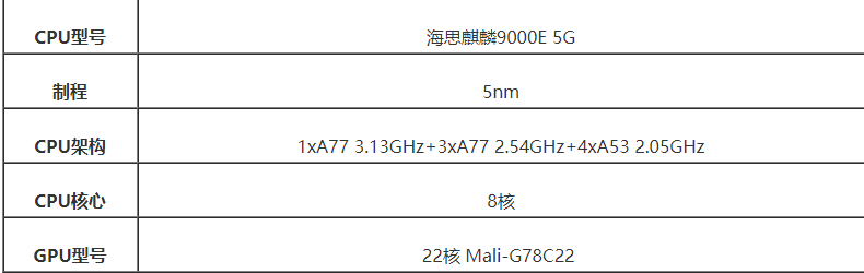 海思麒麟9000E与海思麒麟9000处理器两款处理器均采用5纳米制作工艺,海思麒麟9000E与海思麒麟9000处理器两款处理器的CPU部分是完全一样的,没有区别。两款芯片大核心均采用A77架构,主频高达3.13GHz。