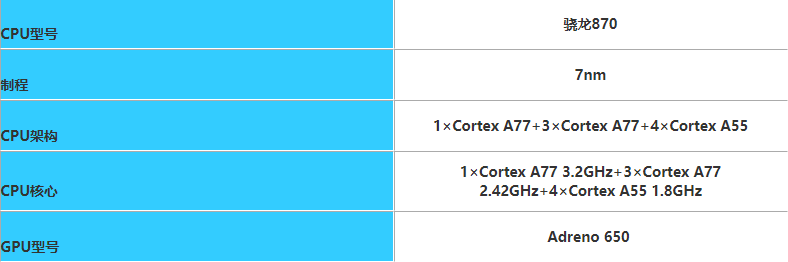 骁龙 870基于台积电 7nm 工艺制成,包括一颗 A77(3.19GHz)超大核 + 三颗 A77(2.42GHz)大核以及四颗 A55(1.8GHz)效能核心,其他方面如 Adreno 650 和 X55 5G 基带未变更,但 WIFI 芯片仅支持到 FastConnect 6800。