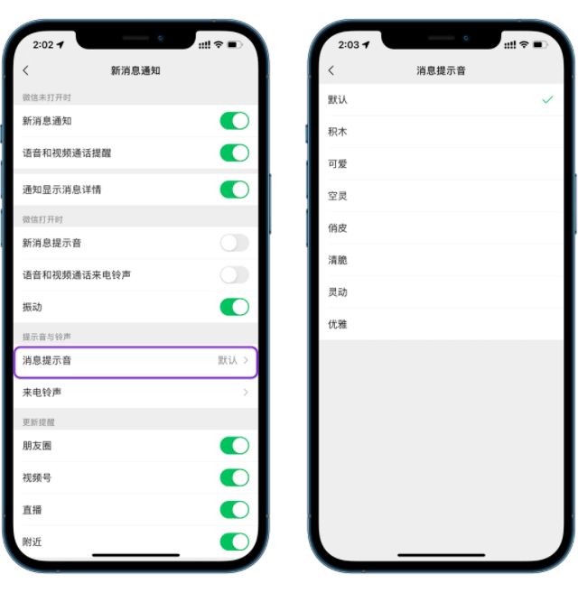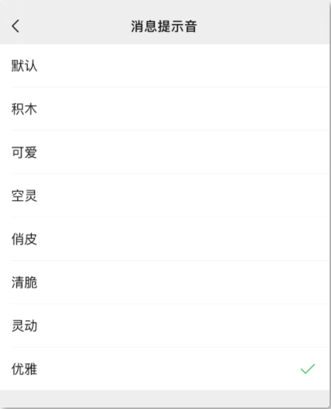 目前 iOS 微信一共 8 种提示音,除了默认提示音外,此次微信在8.0.8版本中新增了7个新的提示音,包括:积木、可爱、空灵、俏皮、清脆、灵动和优雅。