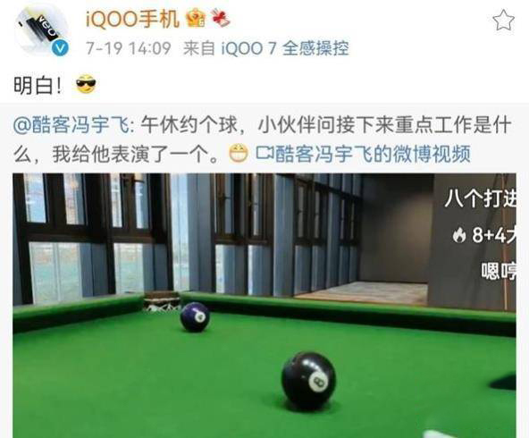 今天下午,iQOO品牌总裁冯宇飞在微博发布了一个视频,视频中的台球号码一个是“8”,一个是“4”,暗示iQOO将于8月4日举行新品发布会。