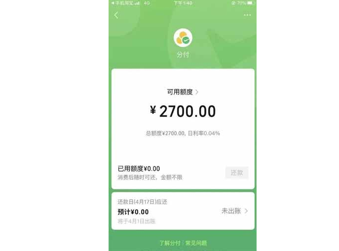 在利息方面,分付会按照用户实际使用天数计算,还款时支付累计的利息。还款后,本金减少,利息也减少。随借随还。根据微信方面的说明,200元用一天的话,每天利息只要几分钱,四舍五入简直不要钱了。