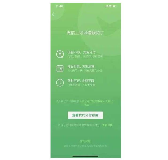部分用户反映称微信上线了 “ 分付 ” 功能。今后,微信上也可以借钱花了。实际上在去年中旬有关这款产品的消息已有流传,当时还处在与部分银行、持牌消费金融公司洽谈合作的阶段。