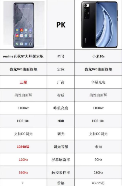 两款手机都是骁龙870的处理器,这个没啥好说的,骁龙865超频版,比骁龙888的散热更好,比天玑1200的性能更强,确实是一款不错的中端手机处理器,没啥毛病。第二个就是屏幕了,很明显带有标红字体的realme真我GT大师探索版要比小米10S更强一些。三星智能硬件有大部分收入都是来自于手机屏幕,像现在国内很多的高端旗舰都是采用的三星屏幕,当然华星光电也不差,但是在三星面前还是有点“小巫见大巫”的意思。
