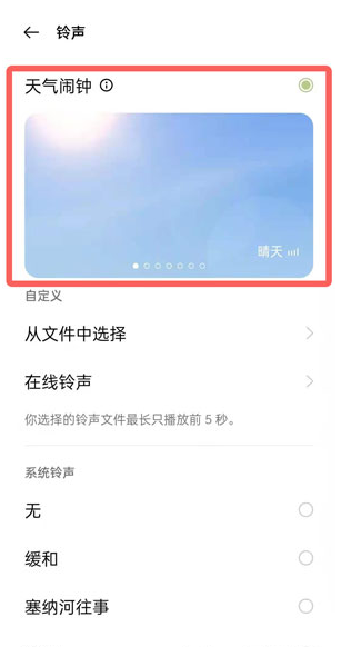4、选中最上方的【天气闹钟】,闹钟将根据天气情况动态匹配闹钟铃声,分别有晴天、多云、雨天、雪天、雷雨、大风、雾霾等天气铃声;