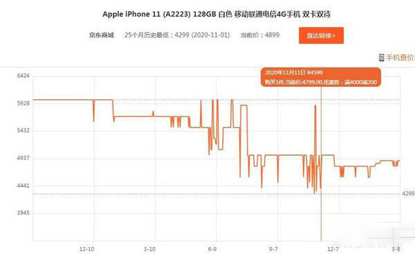 128G的iPhone11在2019年开始发售时的价格为5999元,在第二年的双十一活动时,无特殊券的情况下,价格为4599元。降了1400元,降幅为23.34%。