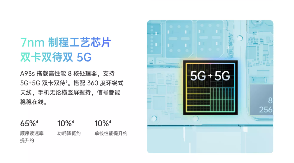 性能部分,A93s搭载的是高性能八核处理器,支持SA/NSA 双模5G网络以及5G双卡双待,可以给用户带来快、稳、省的5G体验。此外,A93s还配备8+256GB的大内存组合,结合五重立体散热系统,夏日期间也能够提供流畅且清凉的游戏体验。