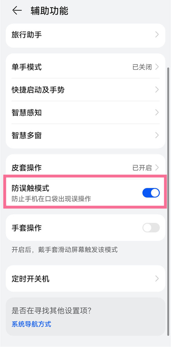 2、进入辅助功能设置页面后,将【防误触模式】右侧的开关开启即可。