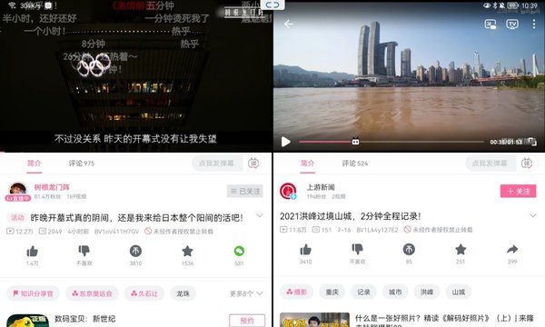 小编以哔哩哔哩APP(以下简称B站)为例,打开B站后,界面左边显示屏幕列表,右边显示视频播放内容。