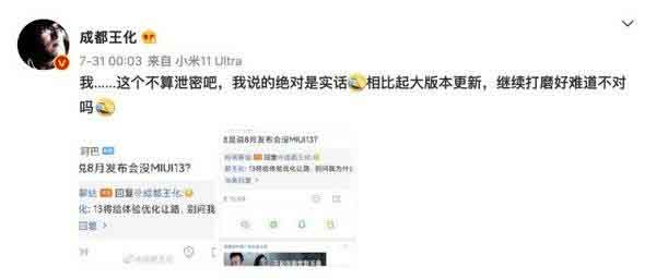 MIUI13 是否会和新的硬件产品一起发布,对于米粉来说是又一个期待。不过,结果可能要让人失望了。小米集团公关部总经理王化在回复网友提到:MIUI13 将给优化体验让路。后来又表示,“大版本更新要继续打磨好。”