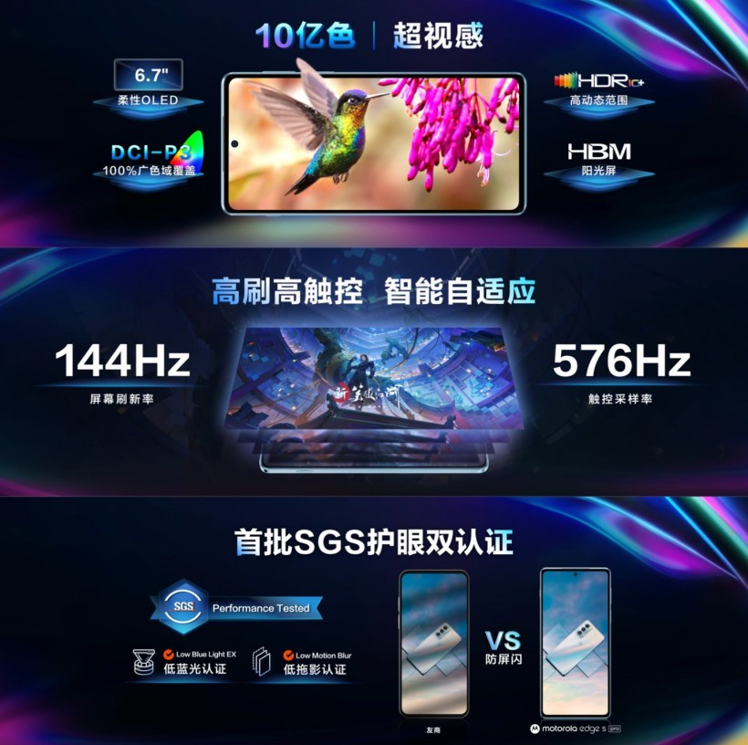 两款新机定位不同,从规格来看,摩托罗拉edge s pro的定位更高一些,正面采用6.7英寸的柔性OLED屏,居中挖空形态,支持144Hz刷新率+576Hz触控采样率,以及10.7亿色显示、HDR10+和DCI-P3广色域覆盖。