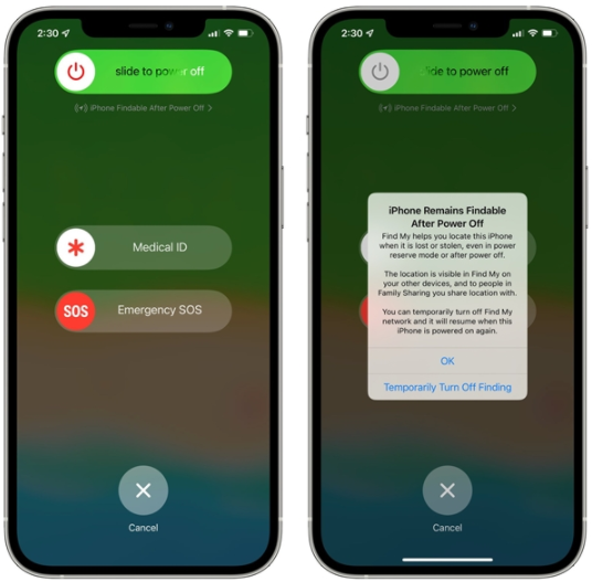 在 iPhone 关机时,有新的提示,在关机后仍然可以找到 iPhone。当然,点击之后可以临时禁用这个功能。