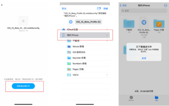 步骤1:下载完成描述文件后,点击【用其他应用打开】,再点击【存储】到我的iPhone/iPad。