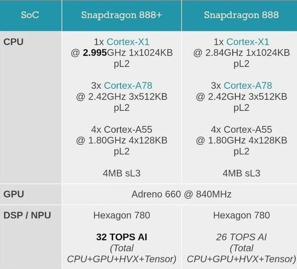 骁龙888 Plus基于三星5nm工艺打造,CPU为:1颗3.0GHz的Cortex-X1超大核,3颗2.42GHz的A78大核,4颗1.80GHz的A55小核,GPU为:Adreno 660 @ 840MHz,AI算力为:32 TOPS 。