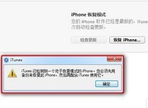 4、 我们会看到电脑端的itunes弹出这样的一句话:“itunes已检测到一个处于恢复模式的iphone。您必须恢复此iphone,然后再配合itunes使用它。”看到这个界面之后我们就可以继续后面的操作了。