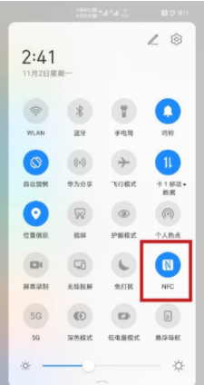 方法一、将屏幕顶部状态栏下滑,在打开的通知面板中选择“NFC”按钮,长按可进入设置界面。