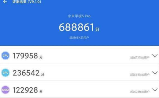 小米平板5 Pro 搭载的是高通骁龙870 移动平台,在安兔兔跑分平台下成绩是 68.8w 分,成绩不拔尖但在可以接受的范围内。
