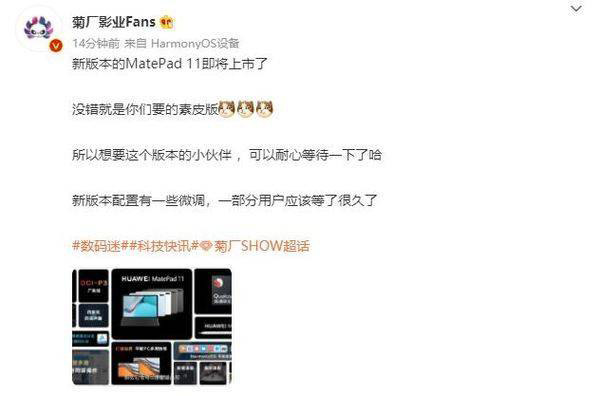 近日,据数码博主@菊厂影业Fans 爆料,新版华为MatePad 11即将上市,该版本为大家比较期待素皮版。