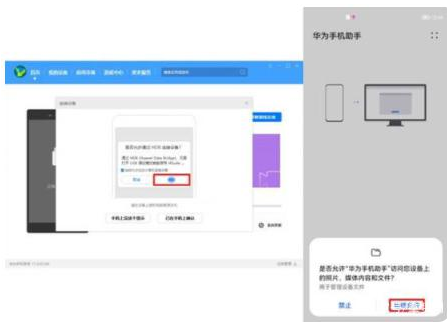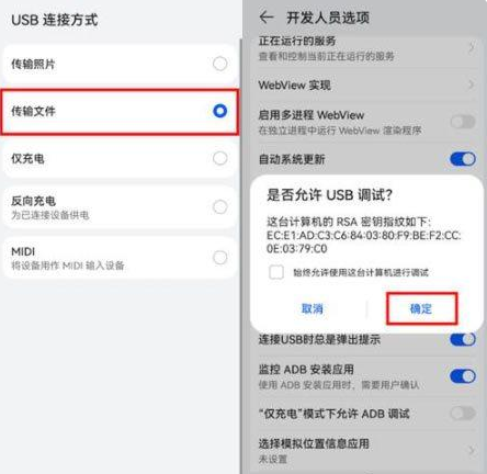 1、升级电脑版华为手机助手到最新版本,然后 USB 数据线连接电脑和手机,连接方式选择“传输文件”,“是否允许 USB 调试”点击“确定”。