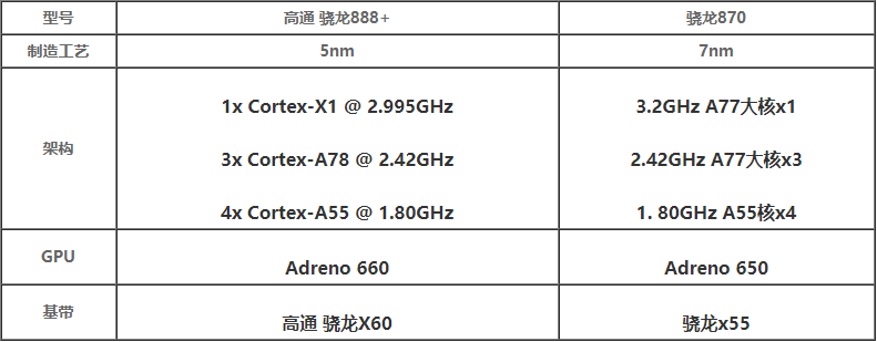 骁龙870搭载但是最为熟练的7nm制作工艺,可以为小伙伴们带来较好的功耗;骁龙870拥有Adreno 650 GPU有了25%的性能提升,并且提供“PC级”渲染能力和游戏HDR显示优化功能;骁龙870搭载骁龙x55,外挂5G基带。骁龙888+搭载骁龙x60,集成5G基带。