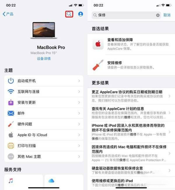 当然,有些设备可能没有登录同一个 Apple ID,那么这时候想要查询的话,点击右上角的“放大镜”图标,然后搜索“保修”。