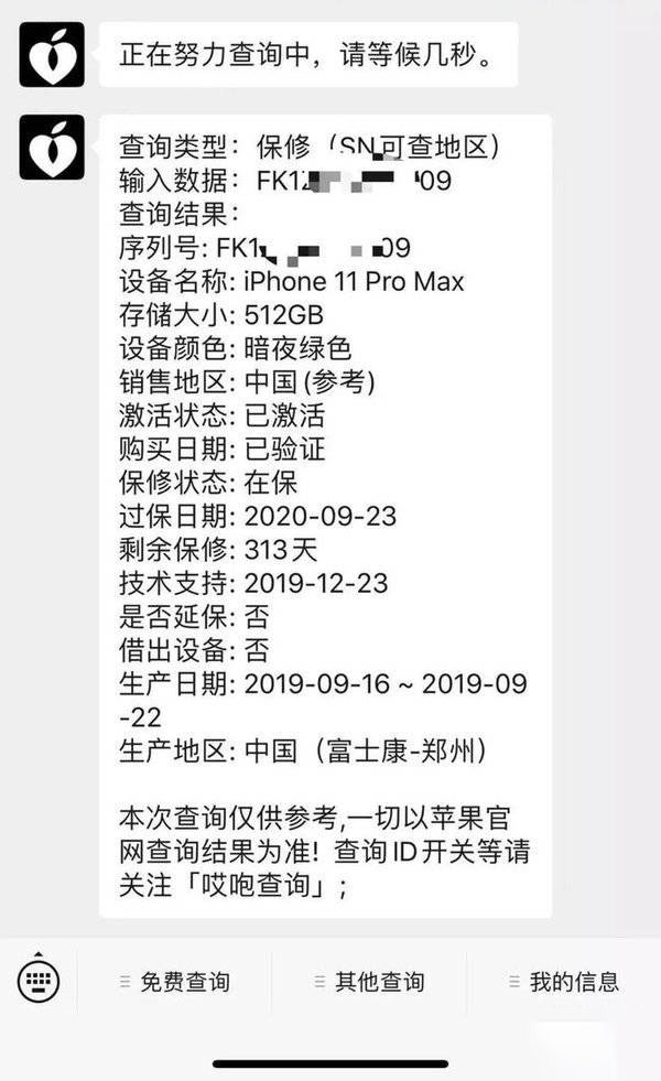 戳下面的小程序就可以直接查询啦!包括手机的激活日期,以及颜色、型号、内存、销售地区、剩余保修期等等信息全都能够查到: