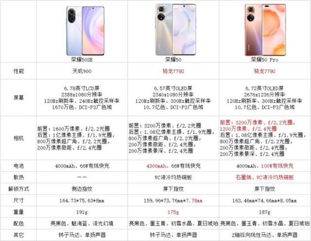 荣耀50se采用的是LCD屏幕,分辨率为2388x1080,支持120Hz刷新率和240Hz触控采样率,而荣耀50和荣耀50Pro则是采用75°的超曲面OLED屏,支持120Hz刷新率和300Hz触控采样率。据网上披露,荣耀50和50 pro采用的都是周冬雨排列的国产屏幕。