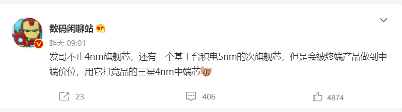 他还表示这款芯片尽管定位次旗舰,但其应用到产品中,将会做到中端价位,用于与三星 4nm 中端竞品进行竞争。