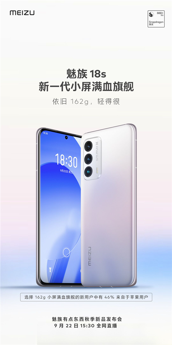 今日,魅族官方晒出了魅族 18s官方定妆照,并表示,对手很强,我们也很不错。轻妙不变,满血升级。魅族 18s新一代小屏满血旗舰依旧162g,轻得很。