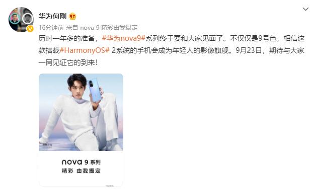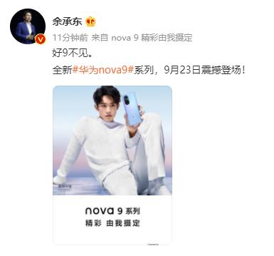 华为终端官方微博及华为消费者业务CEO余承东发布新品海报,正式官宣华为将于9月23发布nova系列的最新产品——华为nova9系列。从海报上我们可以看到代言人仍为易烊千玺。从千玺手持华为nova9展示的产品外观来看,nova9系列的设计非常的拥有个性、极具潮流特性,配色独具匠心,给人一种过目难忘的感觉。