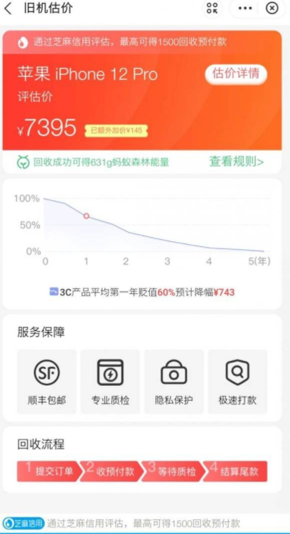 第一个我们先来测试一下速回收的评估iphone12Pro的价格,通过选择手机概况12项后,速回收平台给出这部iPhone12Pro的回收价是7395元。