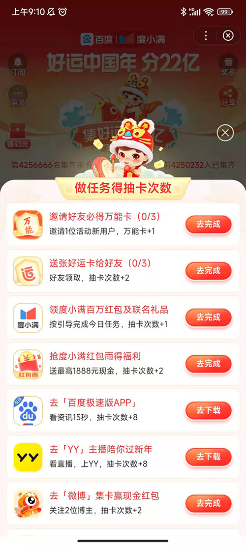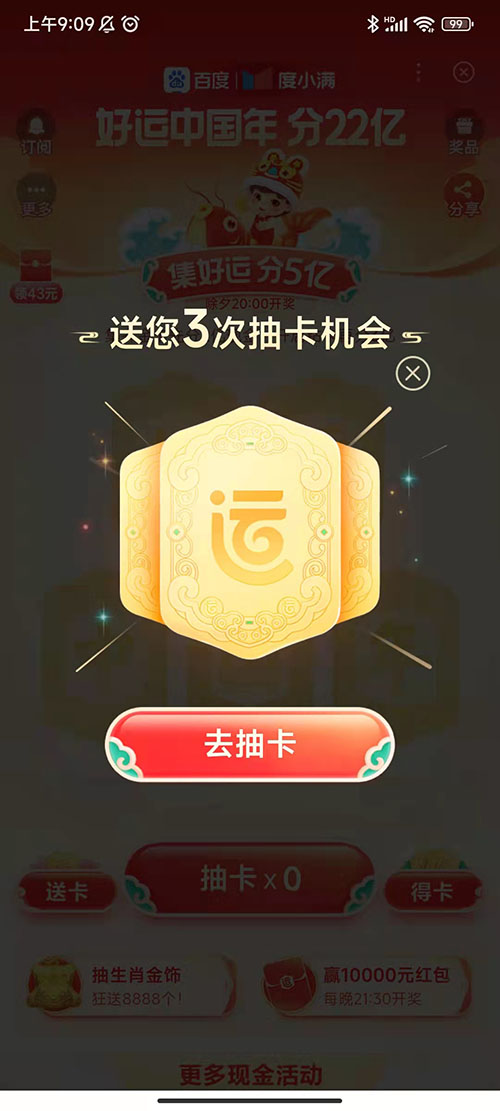 根据活动规则,百度每天收集三张免费卡。此外,您还可以完成向朋友发送好运卡等任务,以增加抽卡次数。收集中、国、好、运、年等5张金卡,先分2亿,开钻卡再分3亿。