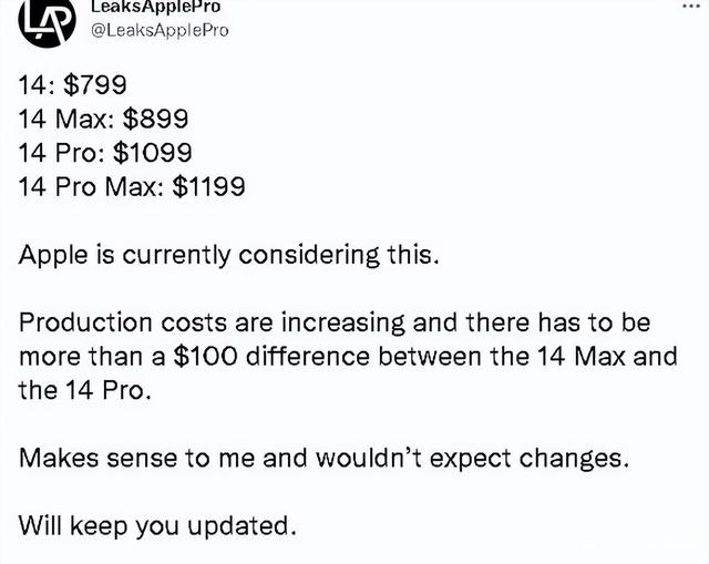 首先被曝光的是iPhone14系列的售价,根据外媒爆料的内容显示,iPhone14系列共包含四款机型,分别是iPhone14、iPhone14Max、iPhone14Pro和iPhone14ProMax,而这四款机型的售价分别是799美元、899美元、1099美元和1199美元,iPhone14系列的售价和上一代产品相比变化并不是很大,基本上维持在这个价格水准。但是根据内部人士的爆料宣称,iPhone14Pro和iPhone14ProMax将会推出8GB+1TB的存储版本,而且iPhone14ProMax的8GB+1TB版本的售价可能会高达15999元。